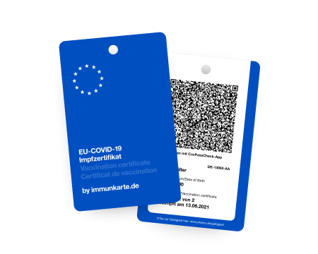 Rückseitig ist auf der Immunkarte® derselbe QR-Code abgebildet wie in der offiziellen CovPass-App oder Corona-Warn-App. Er kann durch alle in der EU verwendeten offiziellen Scan-Apps gelesen werden.